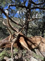 Climbed down and confirmed he was dead, hung my orange on him and headed back to camp to get my gear, and break camp to move down. Boned him out in place, the moss on the river rock was so slick I fell and went for a slip and slide for about 50' on the way down to him, could barely move him without slipping. Had to lower meat and antlers over little cliffs to get him to where I could climb out of the ravine. Brutal pack out through oak brush and cliff bands to get him to my low camp. Took an entire day to get the meat down 1/2 mile to that camp, then got the text on the in-reach, my buddy shot his first 6x6 in another unit, and was coming to help as soon as they got out. 9 mile pack out, got lost in the ferns on the first trip out in the dark, in a steep canyon, within 50' of the trail, but was slipping and sliding with every step with a front and rear quarter in my bag. So, I spent a slightly unpleasant night tending a fire wrapped in a space blanket. Tolerable, but didn't comply with my plan to sleep at the truck that night, where there was cold beer, and an extra sleeping bag.