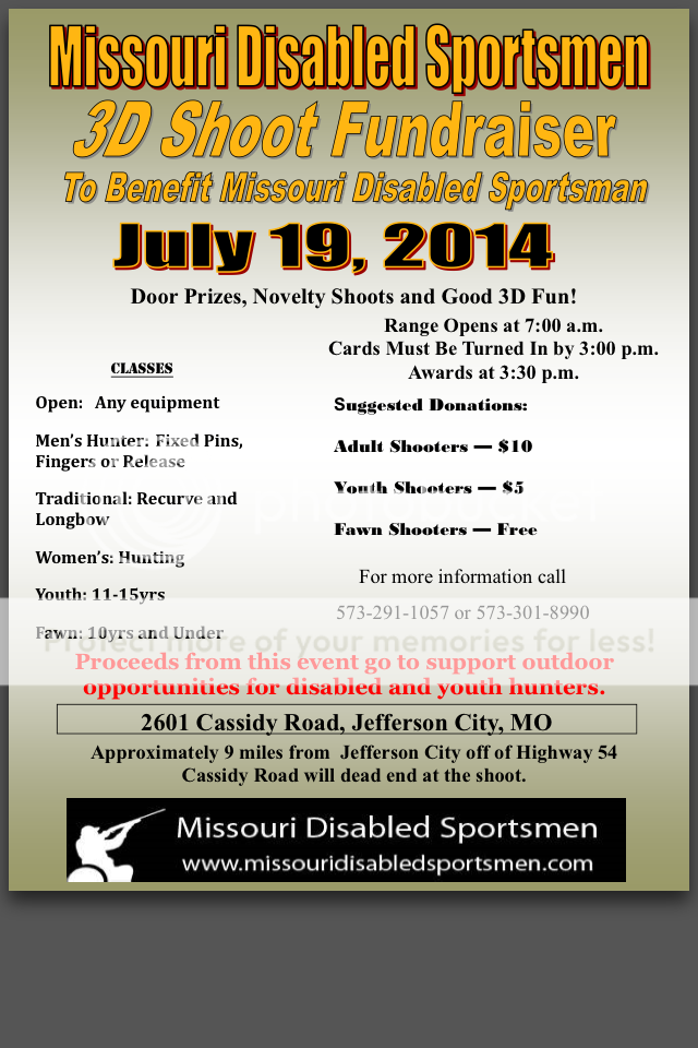 For the past 4 years I've hosted a benefit 3d shoot for Missouri disabled sportsman at my farm. There are several guys who come down on Friday and stay the whole weekend (shoots on Saturday). I'm extending the invitation to all roksliders come down for the whole weekend most extra beds are spoken for but I have a partially finished basement and a 30x50 shop that's will be available to sleep in if needed. This is a kid friendly event ,at least until dark when the campfire stories and barley pops start flowing. Here's a copy of the flyer.