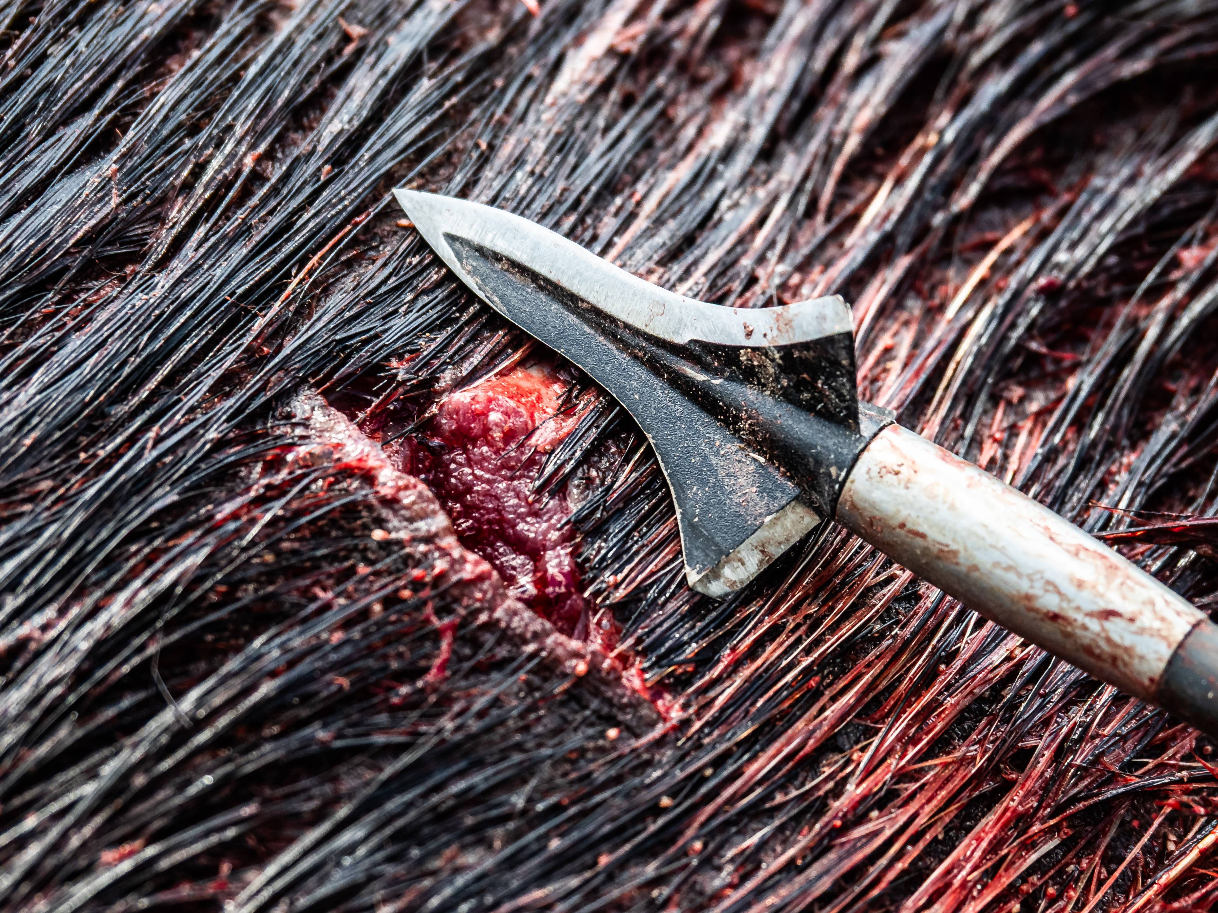 Long sharp 2-blade single-bevel isosceles triangle shaped grizzlys have never let me down...The spine is the only thing that i have found will stop them. They easily go through scapulas and split ribs.