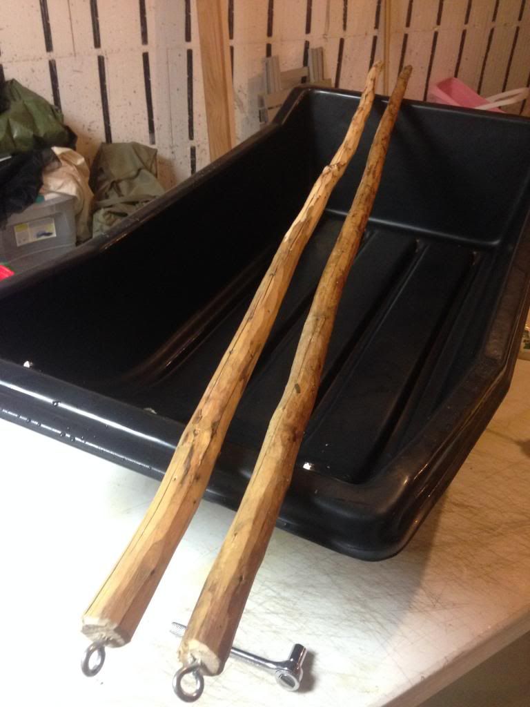 The traces I made from a set of 1" dia fire killed black spruce sticks. I know I can't trust PVC in cold weather, and black spruce is both light and extremely tough. These were cut just over five ft long. Also the hardware can be easily reused if I do have to do a field expedient repair.