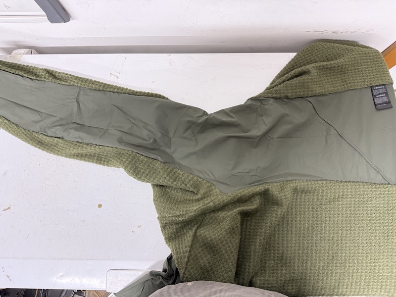 The jacket comes in a few different colors; the dark green (Tundra) is a good hunting color, and the one I chose. The MSRP is $285. The site claims a weight of 13.1 oz; my Large weighs 13.6 oz (for comparison, the uninsulated version weighs 7.6 oz).