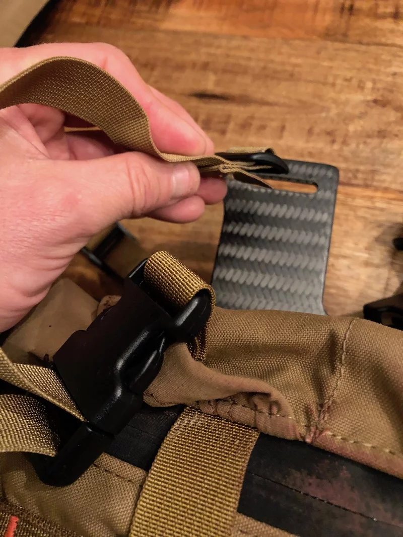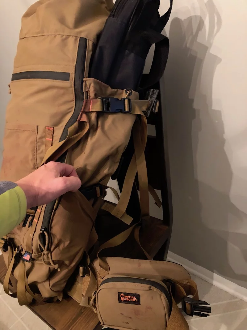 Initial Ascent utilizes a“quick slide/release” system. The theory is there and I really like it, and I like that it’s “molle” adjustable. However, I did lose several straps during my testing.  The first was the strap that goes from the lid to the bag.  It came off four times during my testing and unfortunately I only found it three times.  I also lost one of the frame attachment straps and never found it. In looking at the design, and using it, I wouldn’t think this would be happening. It is, however, and I hope the Initial Ascent team can rectify the problem.