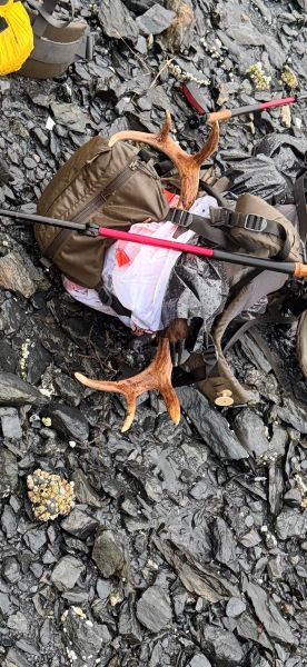 We finished getting the buck processed, loaded, and began our descent. I lost a microspike a few yards into the trip and Steve picked it up behind me. I kept going, there was no good spot to stop and put it back on. I had a microspike on my right foot and a trekking pole for my left hand. Between them I found traction to descend the treacherous mountain in the pouring rain. Once we reached the gentler slope of the alder jungle, we wound our way back to the beach and contacted Ross for pick up.