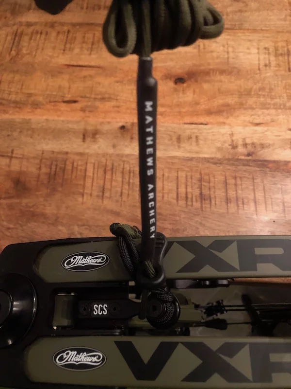 The second thing I noticed was a little “tab” between the limbs at the upper part of the riser, that said “SCS”. I like to be up to speed, but I had no clue what this was. It didn’t take long though to see that this was Mathew’s new integrated Silent Connection System, designed for bow hoist rope, and bow sling attachment. It’s actually an ingeniously simple concept, yet it works great. It’s positioned for a perfect balance when bow is slung, and when raising or lowering to and from the tree stand. To note, the Silent Connection System is available online, not just at dealers, so upgrading your bow is a cinch.