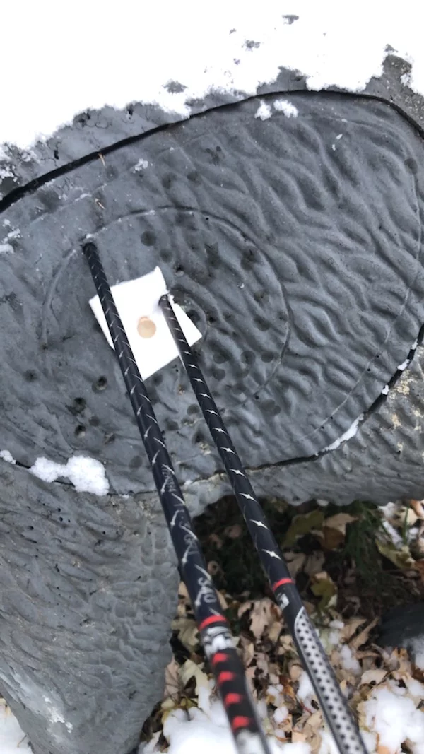 The last pin would be arrow #4, at 40 yards. It landed less than an inch from center. I’d say I was pretty good, at least for a tree stand whitetail hunt. Not really wanting to try and sight in an actual sight tape, I opted to roll down and find out where my 50-yard pin would be. Arrows #5 and #6 are pictured below. I was dialed and ready to go, in six arrows, out to 50 yards, with a completely new rig!!!