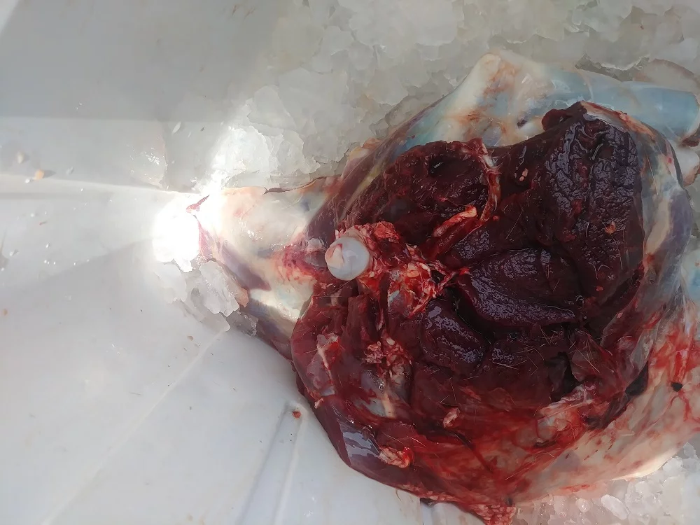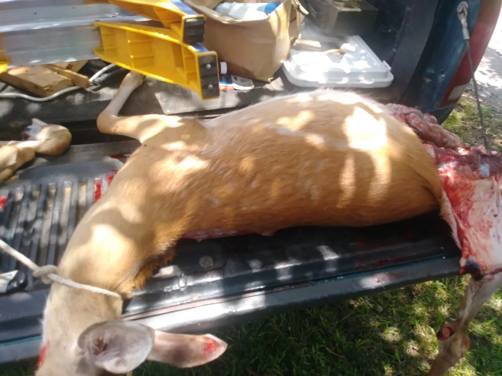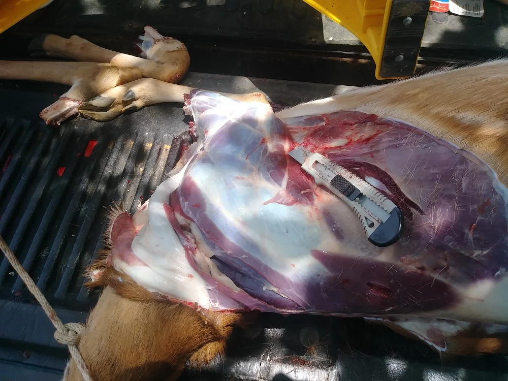 The deer in the pictures was summer roadkill. I picked her up 20 minutes after the accident. An hour and a half later I was showered and back at work because I was able to get the intact animal to my house. The meat was on ice in a cooler in my yard. The abdominal cavity was ruptured and I lost maybe 3-4 pounds of meat on one ham.