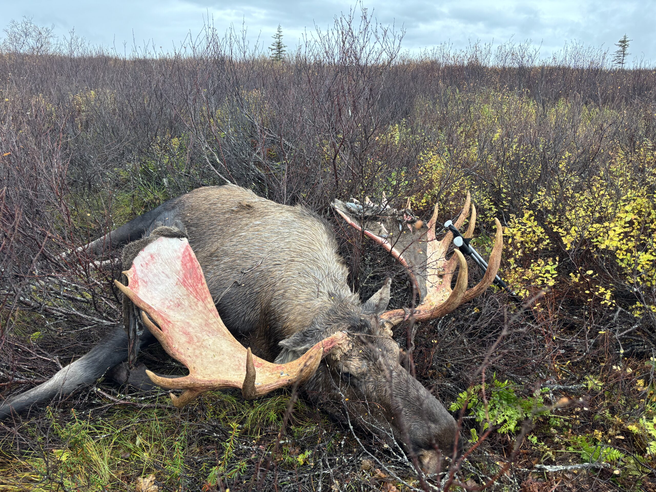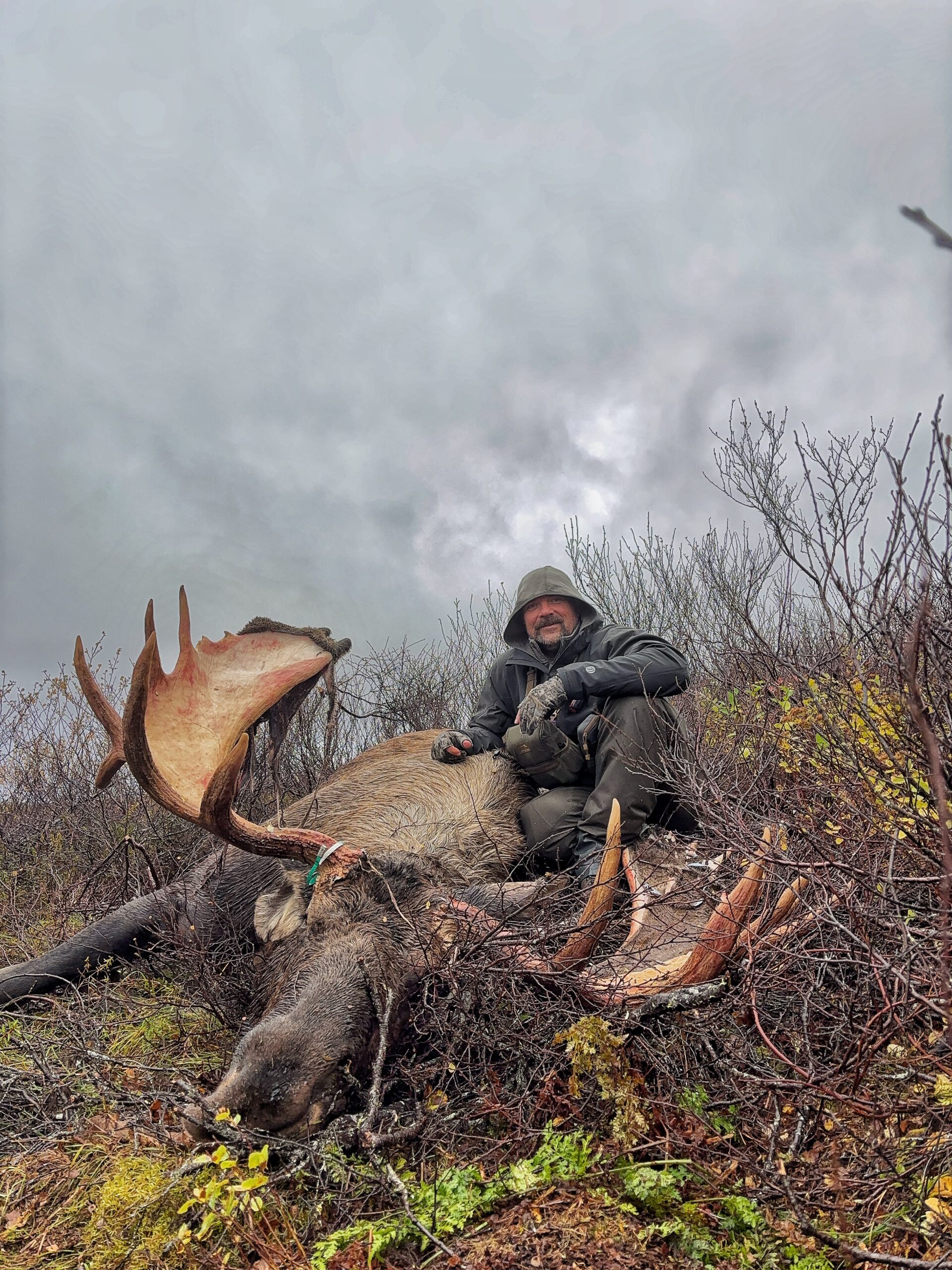 On the 9th, during one of those breaks, I trudged to the top of the ridge, and it took me less than 30 seconds to pick up this bull making his way through the willows. Seeing this beast in person, full-bodied, was nothing short of majestic. Stoically, he strolled between alders and willows, occasionally raking larger bushes. Much like me, it seemed he had had enough of the wind and rain and bedded in short willows, leaving his antlers easily visible. It was then that I had time to run back to camp, gather my gear, and make a stalk without losing his whereabouts.