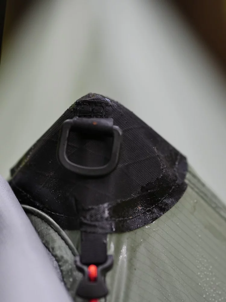 The four corners are the bare minimum needed to be staked out, with an additional four if maximum weather sealing is needed. There are additional guy-out loops sewn into the non-door ends of the shelter for extra stability in high winds. There are also D-loops on the exterior of the pole pockets for added tensioning with stakes and cordage. They can also be used to pitch the shelter without poles utilizing a line tensioned between trees.