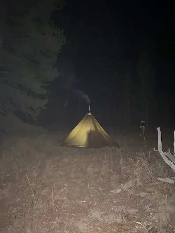 We packed into a spot and set up the Cimarron using a 6-foot dead sapling as the center pole. Then ran to my glassing spots to find some elk before it got dark. Once back to camp I set up the U-turn stove and fired it up. I soon got it roaring and warmed the tent up quite nicely. My girls were pleased and Emmaline my 10-year-old commented that it was awesome to be in the tent with the stove and asked if we could go in it more often!